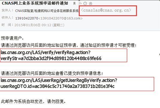 6.目前本系统向用户发送邮件所用的系统邮箱是cnaslas@cnas.org.cn。